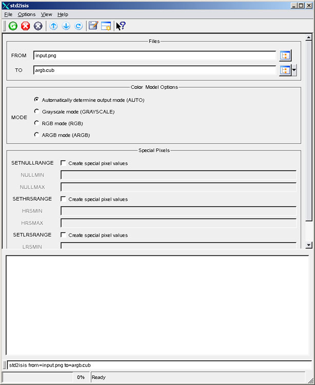 Example GUI Screenshot of the GUI for std2isis, ready to convert the image input.png to the Isis Cube argb.cub, with mode left at its default of AUTOMATIC. |