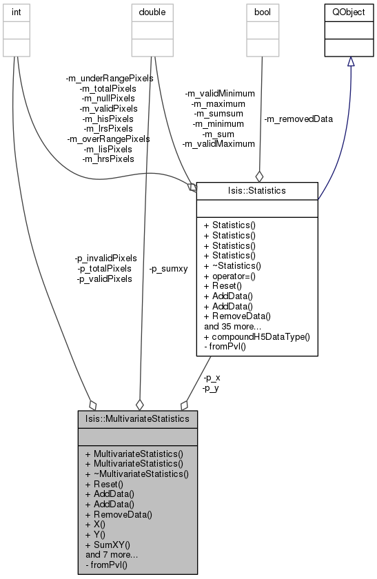 This class is used to accumulate multivariate statisics on two double arrays. In particular, it is highly useful for obtaining the covariance, correlation, and linear regression analysis on the the data. It ignores input values which are Isis special pixel values. That is, if either co-aligned double value is a special pixel then both values are not used in any statistical computation.