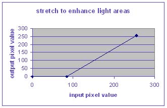 If you are having difficulty visualizing these stretches simply plot the input:output pairs on graph paper and connect the dots or see some of the examples. Note that the input value of each pair is in ascending order. As a reminder, all input pixel values less than the input value for the first pair are mapped to LRS. Likewise, all pixel values greater than the input value for the last pair are mapped to HRS.