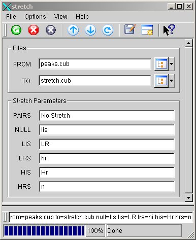 A string must be entered in the form of Where the input values are in ascending order (increasing). There is no limit to the number of pairs although each pair must be separated by a space. The stretch that is entered will be applied to all bands in the cube. By default "No Stretch" is applied which allows users to remap only special pixels if desired.
