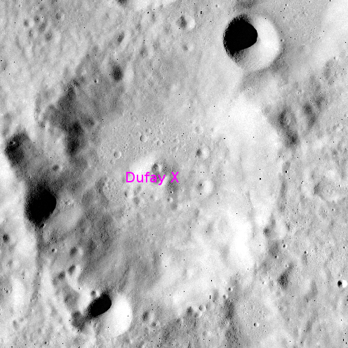 Fig 1A: A cropped view of Apollo image AS16-M-0025 centered on the Dufay X crater. The spacecraft was very close to nadir when the image was taken. |