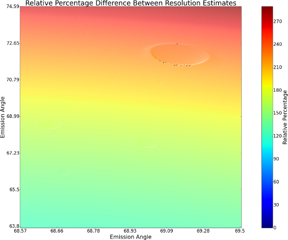 This provides an improved estimate to the standard detector resolution when the image is taken at an oblique angle. In Figure 1A below, an image of the Dufay X crater that was taken near nadir is displayed. Figure 1B is a color map showing the relative difference between the oblique detector resolution, and the original detector resolution as a function of the emission angle. For small emission angles (near nadir) the relative difference between the two estimates is very small. For larger emission angles (off-nadir), the relative difference between the two estimates increases rapidly. Figure 2A is an image of the Carlini crater group taken at an oblique angle. Figure 2B is a color plot of the relative difference between the two estimates showing a minimum of approximately 120% when the emission angles off-nadir are in the range 64-75 degrees. The traditional approximation is obviously not adequate for a case such as this, and the oblique detector resolution should be used.