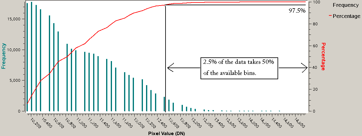 To minimize over or under binning in the output image, the user can chose to only accept data within the range bounded by MINPER and MAXPER on the cumulative histogram. In the example above, if the user set MINPER=0 and MAXPER=97.5, the 8-bit range (including base and multiplier) would include DN's in the range 10,000 to 12,500. A DN above 12500 would be set as the special pixel HRS.