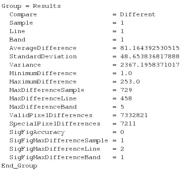 Steven Lambright2007-06-08 Fixed problems with the special pixel comparisons: changed IGNORESPECIAL to only ignore the case where one pixel has a DN value and the other pixel is special, fixed a problem where the special pixel difference would never be the first difference, fixed a comparison of DN value differences before checking if the pixel is special. Added significant figure reports for testing purposes.