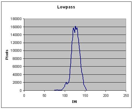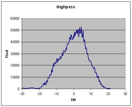 Second, we appy a (NSx1) highpass filter to the lowpass image. This effectively suppress the albedo information in the noise leaving only the noise behind. Note that the noise (third) histogram is centered about zero.