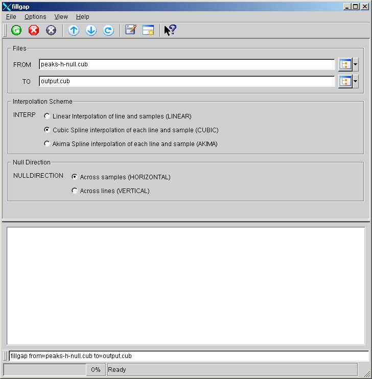 Note: This application will not extrapolate DN values beyond the endpoints of a data set. For example, if you choose to fill gaps that run across lines, then any special pixel values in the first or last vertical column of the image will not be filled. If any of these are not in a corner, you can run fillgap again using the output of the first run as input and SAMPLE as the DIRECTION parameter. Corner pixels can be filled by using the specpix application or the lowpass filter application.