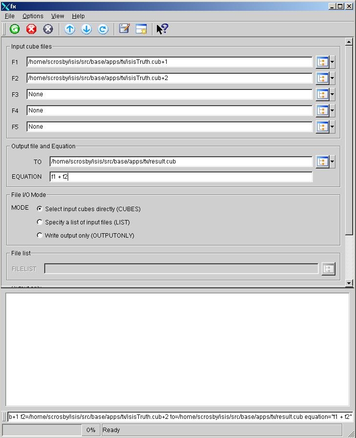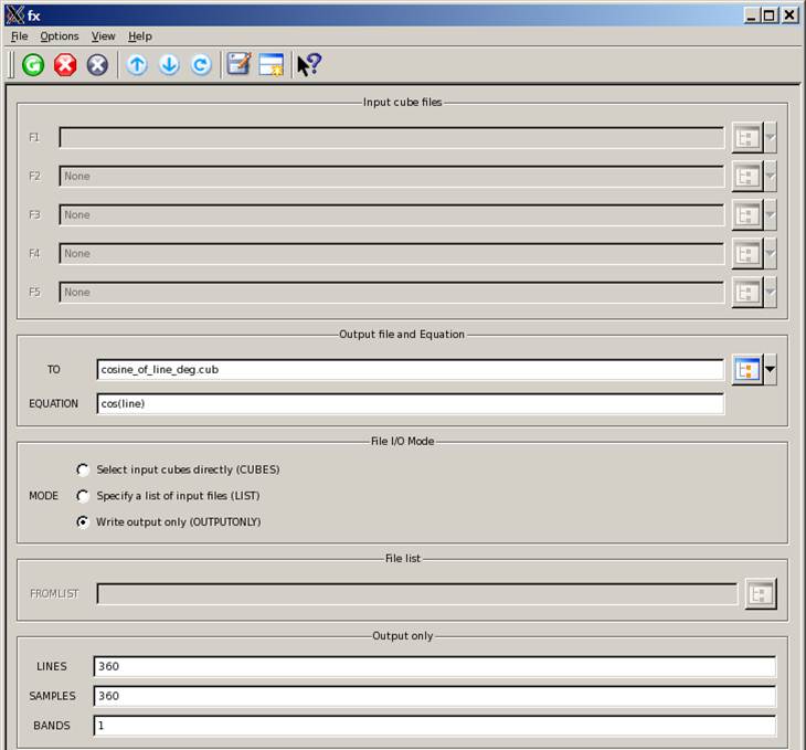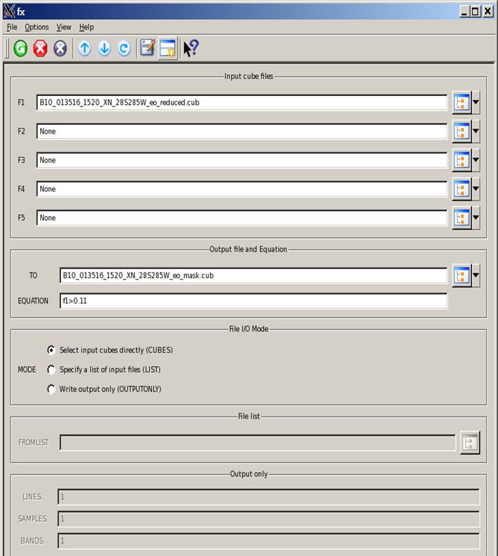 Five files or fewer can be entered for parameters F1 to F5 under the "Input Cube Files" section to specify the input data. A second method to specify data is to include an arbitrary number of files in a file list and enter the list name in the fromlist parameter that is only visible upon selecting the MODE list located under "File I/O Mode." If the user selects "OUPUTONLY" under "File I/O Mode" then an output file is created based on an equation provided by the user. The user will also need to specify the number of lines, samples, and bands of the output file.