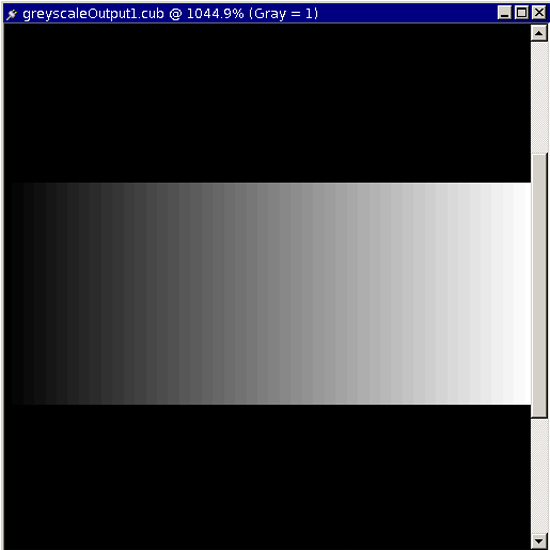 This is an example of the the output image with the given parameters. It is a 49 line by 20 sample cube with the a DN of 50 for the pixels in the first line. Subsequent lines decrement by a pixel value 0.5208 until the last line, which has a DN of 25. |