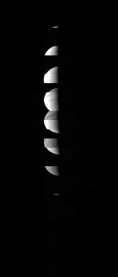 FROM The full JunoCam image with all of the image data for each filter and frame adjacent. The top of the image is the first frame. The filters in descending order are BLUE, GREEN, and RED. This image has been reduced by a factor of 4. The original image is 1648x3840. |