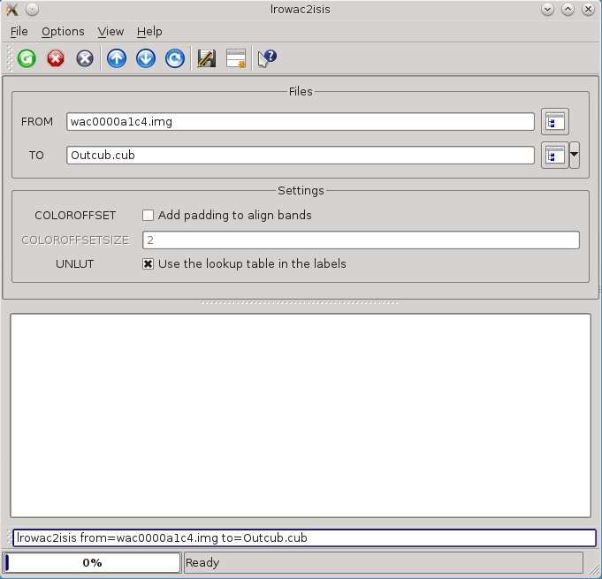 Screen shot of the GUI with parameters filled in to format the LRO WAC EDR image as an ISIS cube using the default settings.