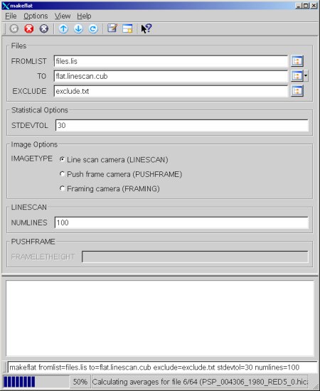 makeflat fromlist=files.lis to=flat.linescan.cub exclude=exclude.txt stdevtol=30 numlines=100