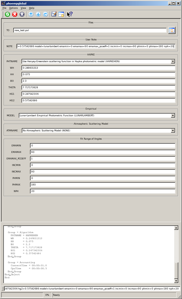 phoempglobal to=new_test.pvl note="phoempglobal test using photometric settings for Mercury provided by Brett D. Parameters: to=new_test.pvl wh=0.249831313 hh=0.075 b0=2.3 theta=7.717173828 hg1=0.247542306 hg2=0.57542686 model=lunarlambert emamin=0 emamax=90 emamax_pcoeff=1 incmin=0 incmax=90 phmin=0 phmax=180 nph=20" wh=0.249831313 hh=0.075 b0=2.3 theta=7.717173828 hg1=0.247542306 hg2=0.57542686 model=lunarlambert emamin=0 emamax=90 emamax_pcoeff=1 incmin=0 incmax=90 phmin=0 phmax=180 nph=20
