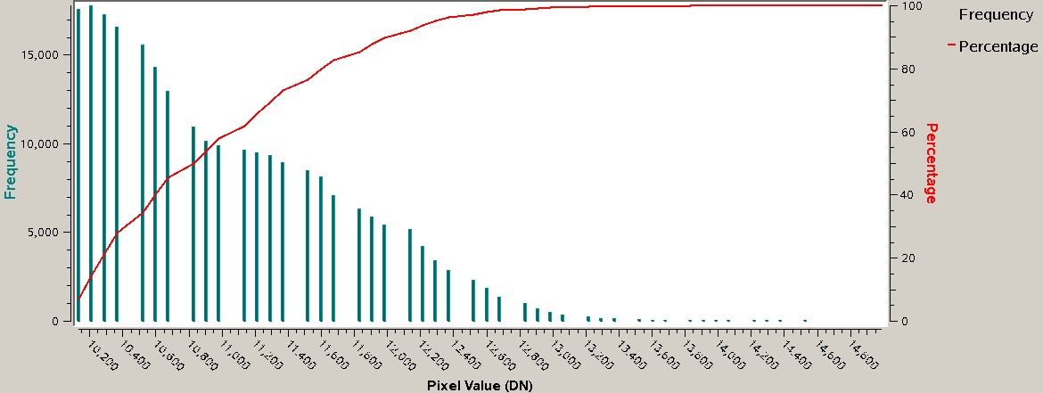 To minimize over or under binning in the output image, the user can chose to only accept data within the range bounded by MINPER and MAXPER on the cumulative histogram. In the example above, if the user set MINPER=0 and MAXPER=97.5, the 8-bit range (including base and multiplier) would include DN's in the range 10,000 to 12,500. A DN above 12500 would be set as the special pixel HRS.