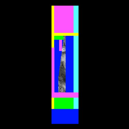 The original, 82x361 image. NULL, HRS, LRS, HIS, and LIS pixels are shown in blue, light green, yellow, pink, and light blue, respectively. NULL SPACE is shown here in black.