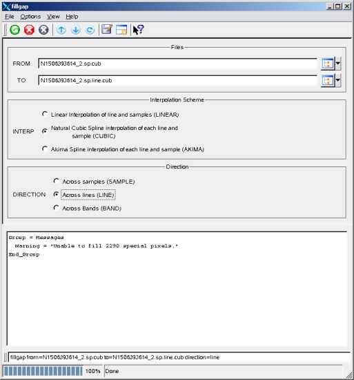 Note: This application will not extrapolate DN values beyond the endpoints of a data set. For example, if you choose to fill gaps that run across lines, then any special pixel values in the first or last vertical column of the image will not be filled. If any of these are not in a corner, you can run fillgap again using the output of the first run as input and SAMPLE as the DIRECTION parameter. Corner pixels can be filled by using the specpix application or the lowpass filter application.