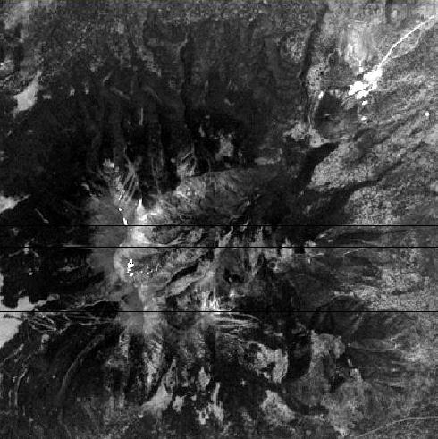 This is the output image that results after a cubic interpolation to fill the special pixel data gaps. Notice all special pixels have been filled except the top left corner of the image. Special pixels in the corners of an image can not be filled by the fillgap application since they are beyond the endpoints of any known data values (i.e. DNs values of samples and lines).