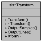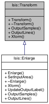 This class is used as a virtual base class for rubbersheeting (geometric warping) of image data. In Isis, rubbersheeting is performed by a transform from output space to input space, where a space could be a disk cube or an internalized memory cube. In particular, the transform must provide a method for converting output pixel locations (sample,line) to input pixel locations. A very simple example of a transform is a translation (shifting the cube left/right and up/down). More complex transforms can be created such as rotations, scaling, and converting to a map projection. The Transform class is "pure virtual" and should never be instantiated but instead used in an inheriting class. Using the translation example: