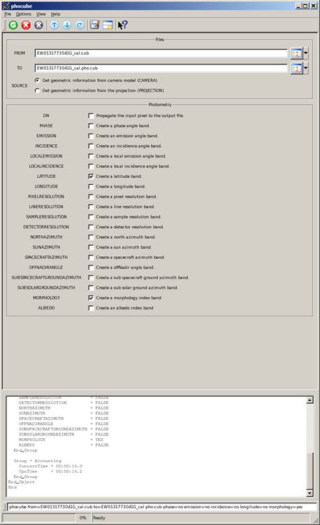 Example: phocube from=EW0131773041G_cal.cub to=EW0131773041G_cal.pho.cub morph=true dn=true Sample of image label: Group = Dimensions Samples = 1024 Lines = 1024 Bands = 7 End_Group Group = BandBin Name = ("750 BW 5", "Phase Angle", "Emission Angle", "Incidence Angle", Latitude, Longitude, Morphology) Number = (7, 7, 7, 7, 7, 7, 7) Center = (748.7, 748.7, 748.7, 748.7, 748.7, 748.7, 748.7) Width = (5.1, 5.1, 5.1, 5.1, 5.1, 5.1, 5.1) End_Group Note: The first band retained the BandBin Name value from the input file. The program has "Phase Angle," "Emission Angle," "Incidence Angle," "Latitude," and "Longitude" options pre-selected.