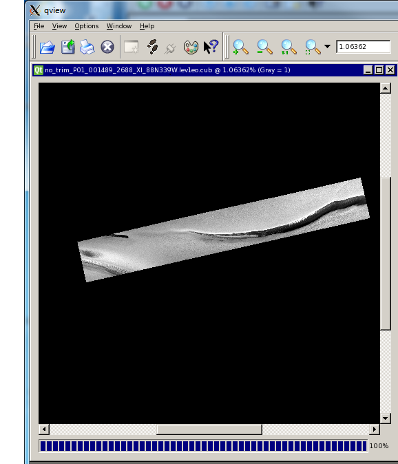 This is the output of cam2map demonstrating the use of MATCHMAP=YES with an ISIS level 2 image as MAP. Contrast this output with the level 2 image used as MAP and with the next example which was also created with MATCHMAP=YES, but uses an ISIS map file as MAP.