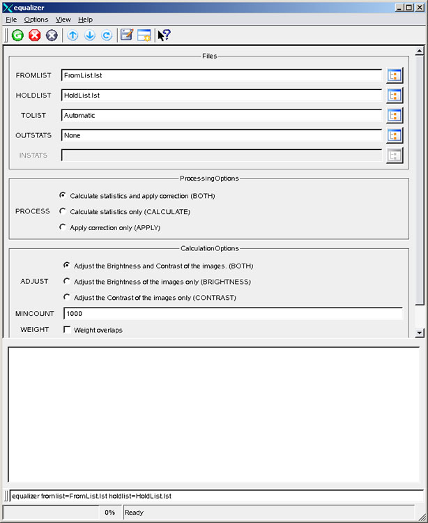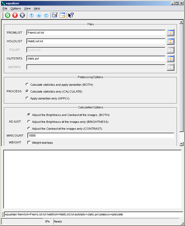 Equalizer GUIScreenshot of the GUI with parameters set to calculate the gain and offset and then to apply corrections. Because the TOLIST parameter is set to its default value of "Automatic," each output image will be placed into the directory of its corresponding input image. Also, because the OUTSTATS parameter is set to its default value of "None", a record of the calculations performed will only be written to the print file.