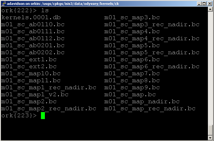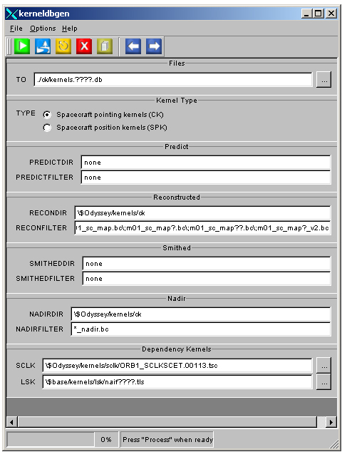 kerneldbgen 'to=kernels.????.db type = ck reconfilter= *_nadir.bc recondir = $Odyssey/kernels/ck reconfilter= m01_sc_ab*.bc;m01_sc_ext?.bc;m01_sc_map.bc;m01_sc_map?.bc;m01_sc_map??.bc;m01_sc_map?_v2.bc' lsk = $Base/kernels/lsk/naif0008.tls sclk = $Odyssey/kernels/sclk/ORB1_SCLKSCET.00113.tsc'