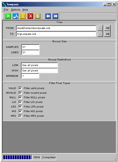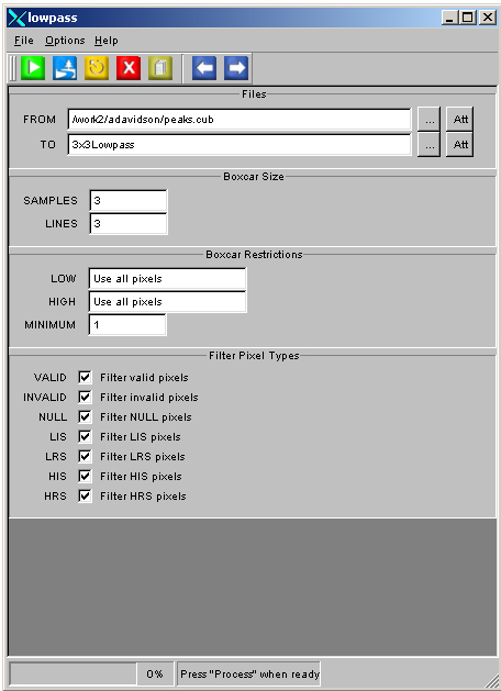 lowpass guiScreenshot of the GUI set to filter all pixels for the image using a three by three boxcar. Note that as many of the default parameters as are allowed are being used.
