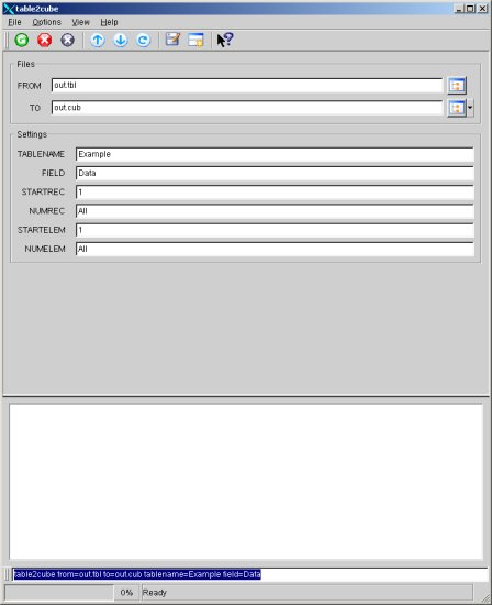table2cube GUI with defaultsIn this example table2cube will convert the table "Example," field "Data" from out.tbl to out.cub .