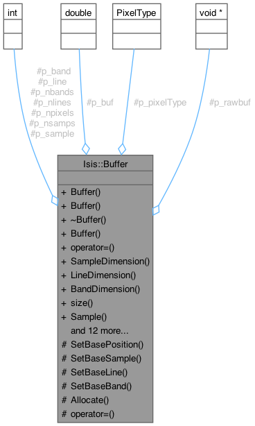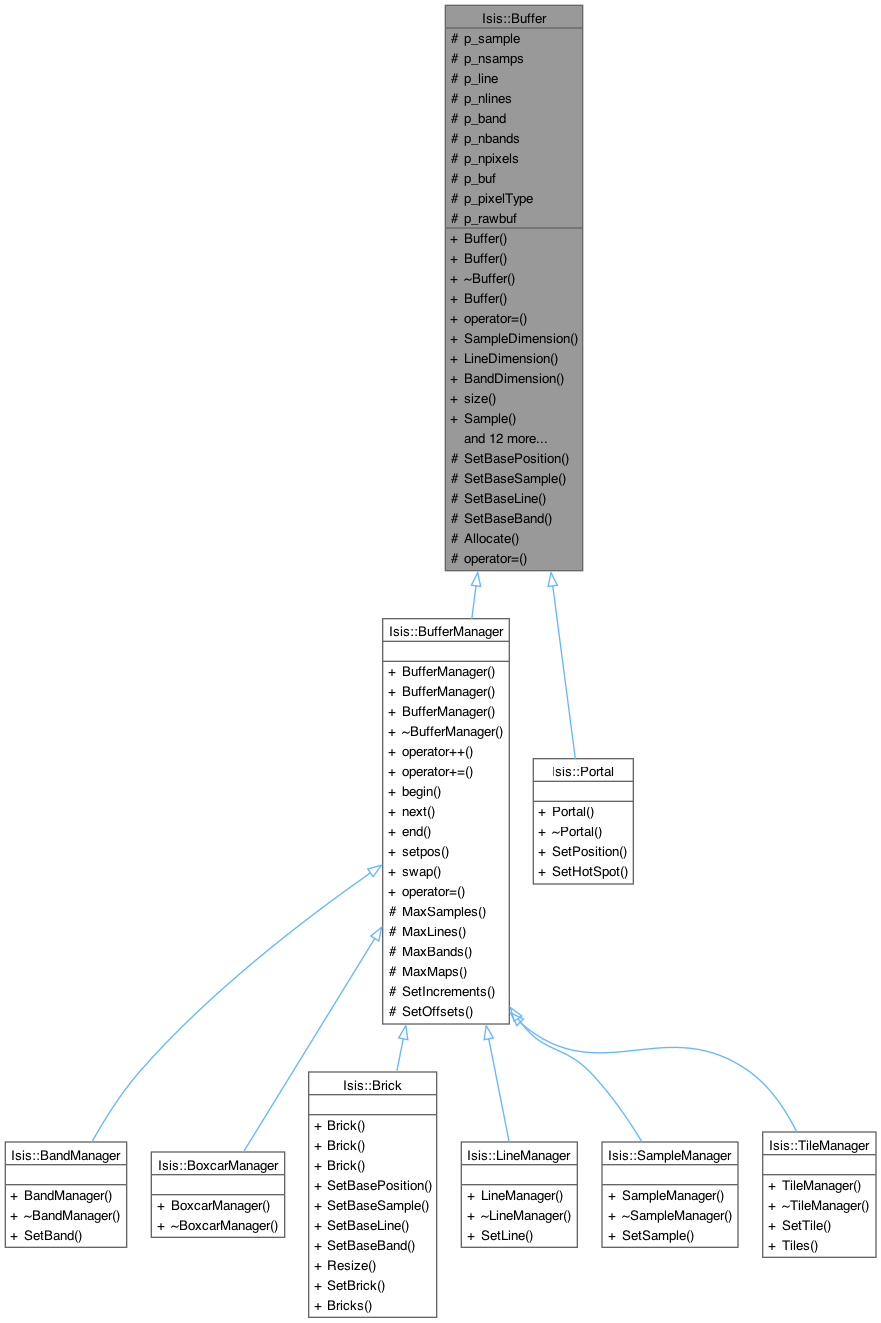 This is the base class for I/O on buffers of data from cubes. The programmer can define an arbitrary shape using this object and then read or write that shape from a cube. Some example shapes are lines, tiles, columns, cublets, and spectral pencils. Data which is read or written to a cube will always be contained within an internal buffer of type double. There are methods for querying the sample/line/band position based upon the buffer index. Note that this class does not read/write data but is used in conjunction with the class to read/write data. Even more powerful are the BufferManager classes which inherit this object and can step through cubes by line, tile, boxcar, column, etc.
