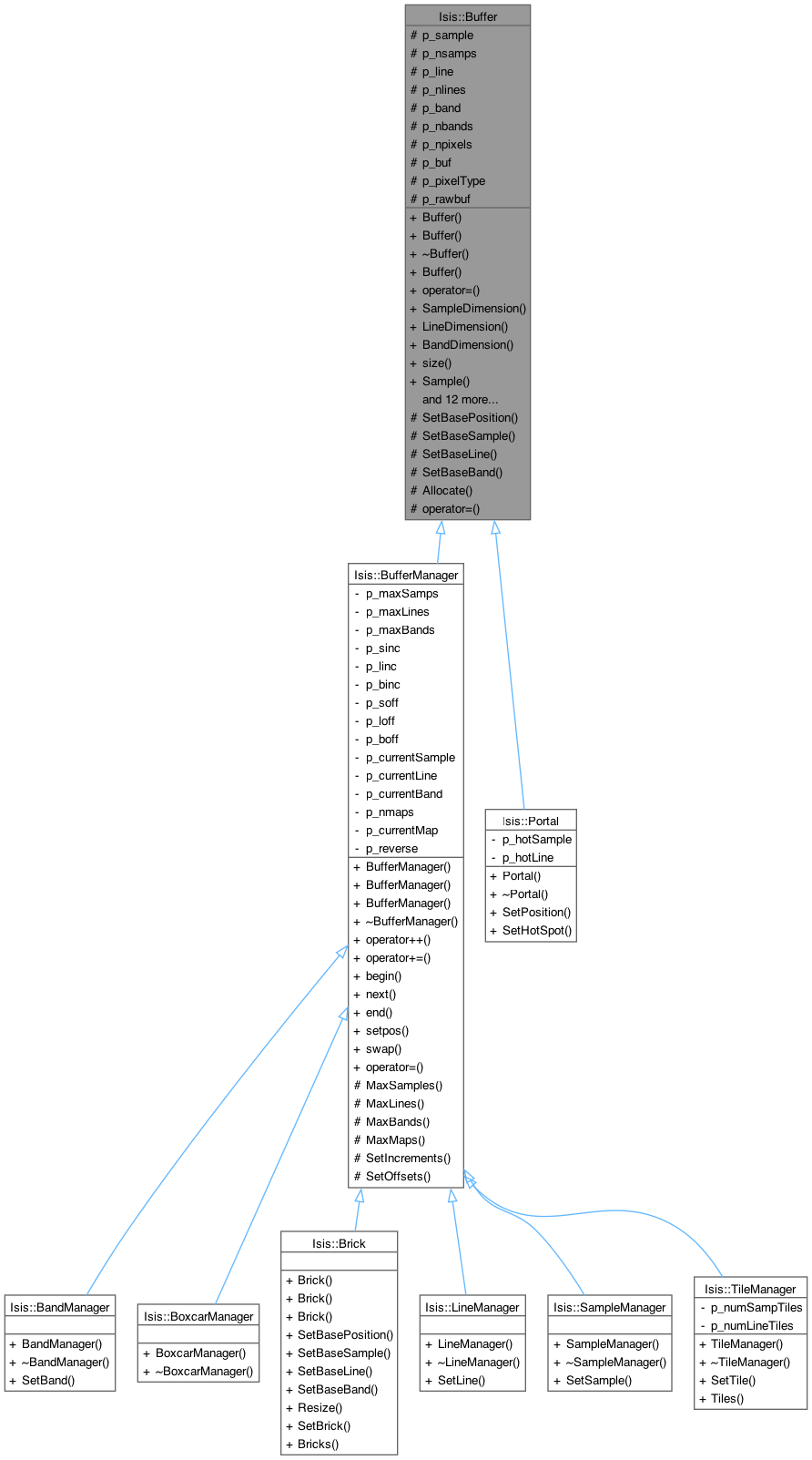 This is the base class for I/O on buffers of data from cubes. The programmer can define an arbitrary shape using this object and then read or write that shape from a cube. Some example shapes are lines, tiles, columns, cublets, and spectral pencils. Data which is read or written to a cube will always be contained within an internal buffer of type double. There are methods for querying the sample/line/band position based upon the buffer index. Note that this class does not read/write data but is used in conjunction with the class to read/write data. Even more powerful are the BufferManager classes which inherit this object and can step through cubes by line, tile, boxcar, column, etc.