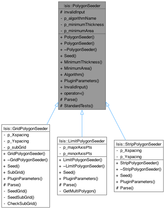 Implemented in Isis::GridPolygonSeeder, Isis::LimitPolygonSeeder, and Isis::StripPolygonSeeder.