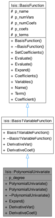 This is a derived class from Basis1VariableFunction which provides the capabilities of a polynomial equation in one variable with degree n, where n is specified during the object construction. For example, Degree = 1 z = a + b*x Degree = 2 z = a + b*x + c*x**2 Degree = 3 z = a + b*x + c*x**2 + d*x**3 In general the number of coefficients will be degree + 1.