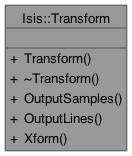 This class is used as a virtual base class for rubbersheeting (geometric warping) of image data. In Isis, rubbersheeting is performed by a transform from output space to input space, where a space could be a disk cube or an internalized memory cube. In particular, the transform must provide a method for converting output pixel locations (sample,line) to input pixel locations. A very simple example of a transform is a translation (shifting the cube left/right and up/down). More complex transforms can be created such as rotations, scaling, and converting to a map projection. The Transform class is "pure virtual" and should never be instantiated but instead used in an inheriting class. Using the translation example:
