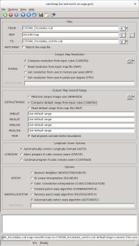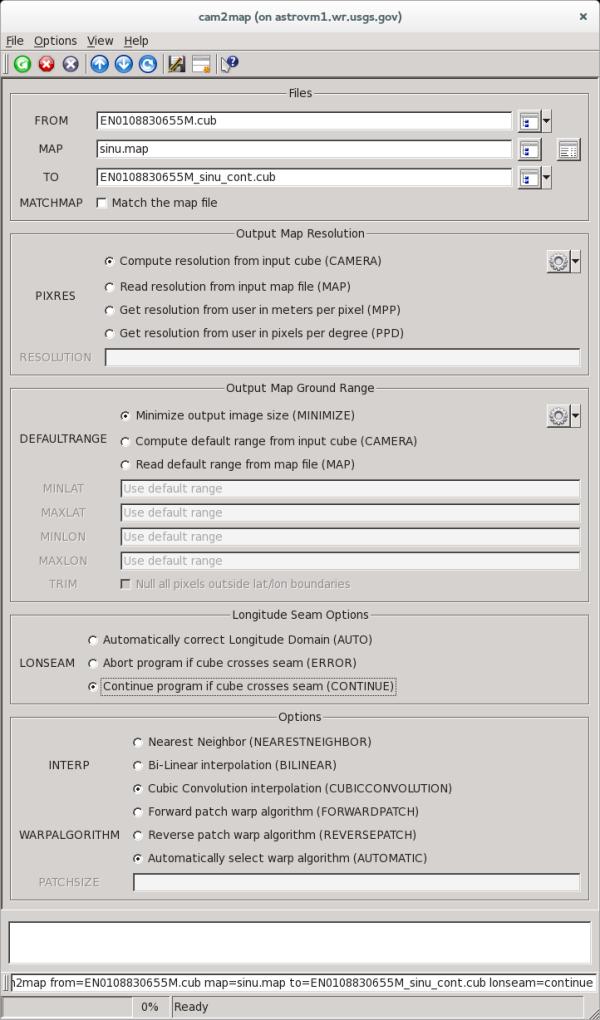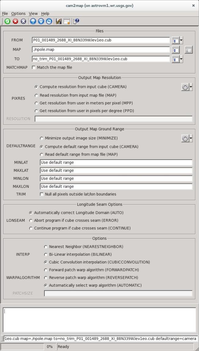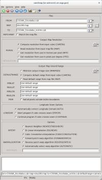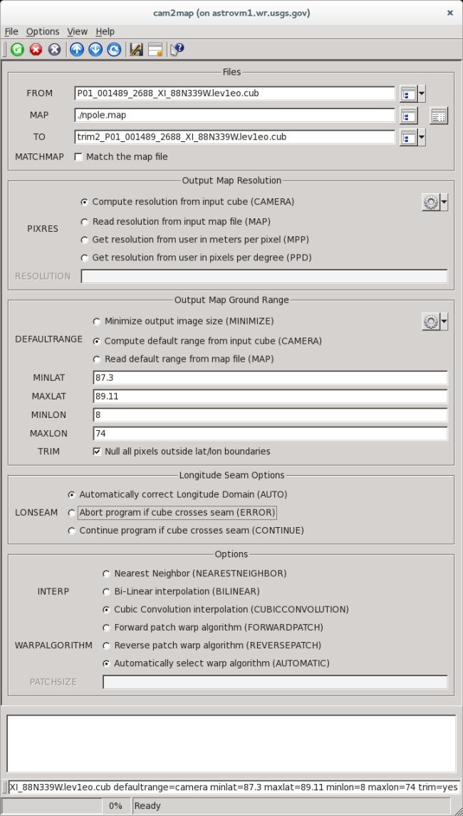 TRIM=NO GUIScreen shot of the entire GUI with parameters filled in for FROM file, TO file, default PIXRES, and Output Map Ground Range set to the CAMERA of the input cube. The rest of the parameters are all set to the defaults.