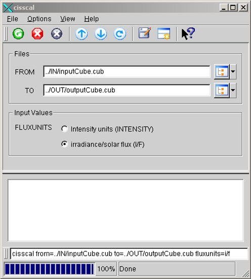 Cisscal Gui using I/FScreenshot of GUI with parameters filled in to perform the cisscal application. Input and output cubes are always required. The flux unit I/F (default) is chosen.