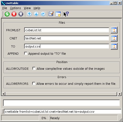 cnettable GUIScreenshot of the GUI with parameters set to take a list of cubes a control network and output to a text file.