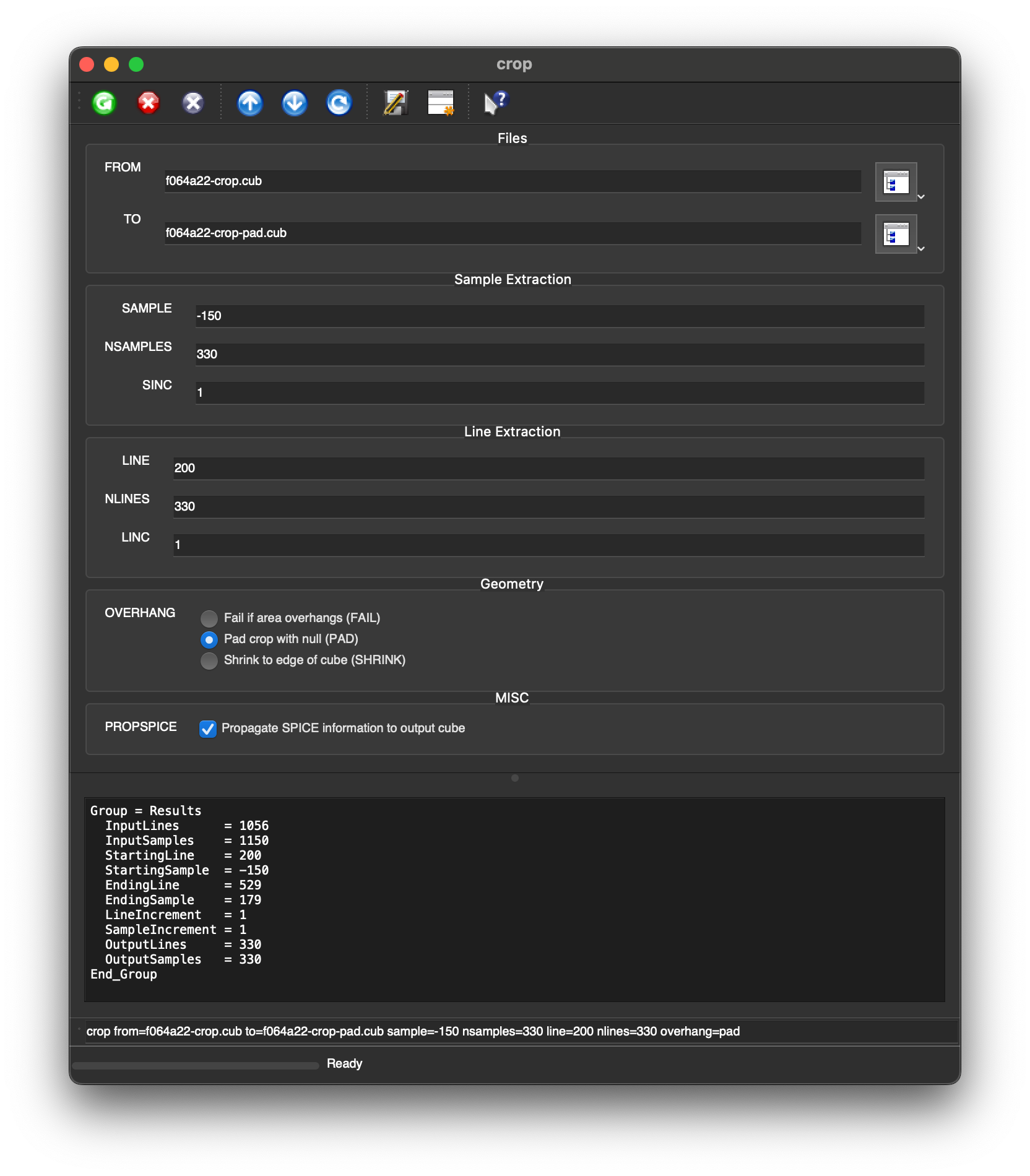 crop from=f064a22-crop.cub to=f064a22-crop-pad.cub sample=-150 nsamples=330 line=200 nlines=330 overhang=pad