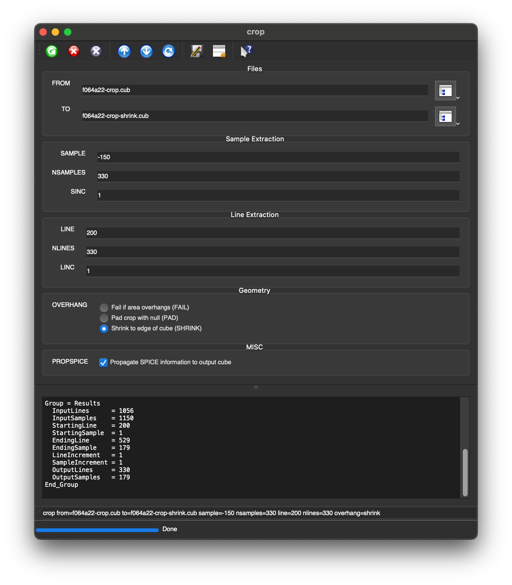 The parameter PROPSPICE applies to Level1 images. The SPICE information must have been propagated to the cropped output cube to obtain any camera geometry or photometric information. The default setting for PROPSPICE is "TRUE." When the default setting is used, all the keywords in the labels of the input file are transferred to the output file. In addition, the keywords that describe the area that was extracted out of the input cube are also added to the AlphaCube group in the labels.