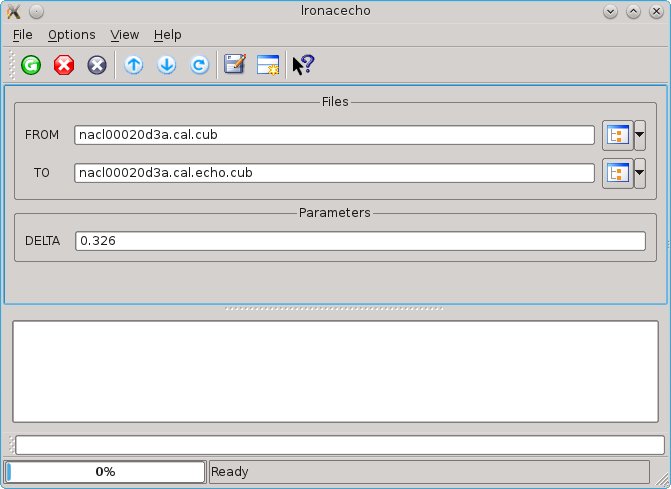 This is what the graphical interface should look like in a typical run. The input to lronacecho in this example is nacl00020d3a.cal.cub, a calibrated LRO NACL image with no summing. The resulting image, nacl00020d3a.cal.echo.cub, will have echo effect removed.