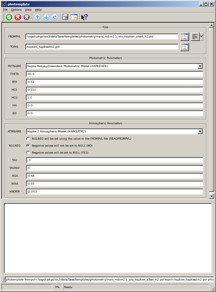 Links open in a new window.| Output PVL file | The output PVL file will contain the photometric parameters to be applied to the input cube. Load the PVL file parameters using the photemplate GUI and manually enter required parameter names without any values assigned. |