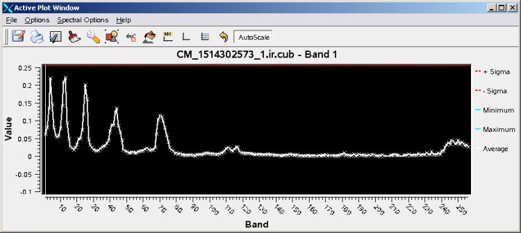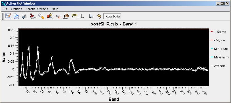 This is the spectral plot of the center point of the image, (32, 32), and shows all bands, 1- 256. No averaging has been applied, this is clear partialy because of th extreme peaks visible in the first half. The peaks are related to values which differ significantly from the bands around them.