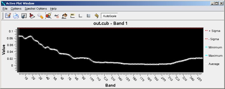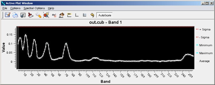 This is the spectral plot of the center point of the image, (32, 32), and shows all bands, 1- 256. No averaging has been applied, this is clear partialy because of th extreme peaks visible in the first half. The peaks are related to values which differ significantly from the bands around them.