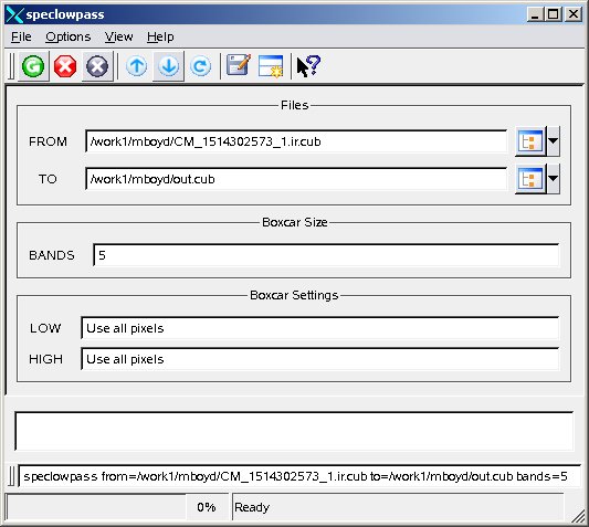 This program's GUIScreenshot of the GUI wit h parameters set to perform the spechighpass filter with a 5 band boxcar on the image CM_1514302573_1.ir.cub.